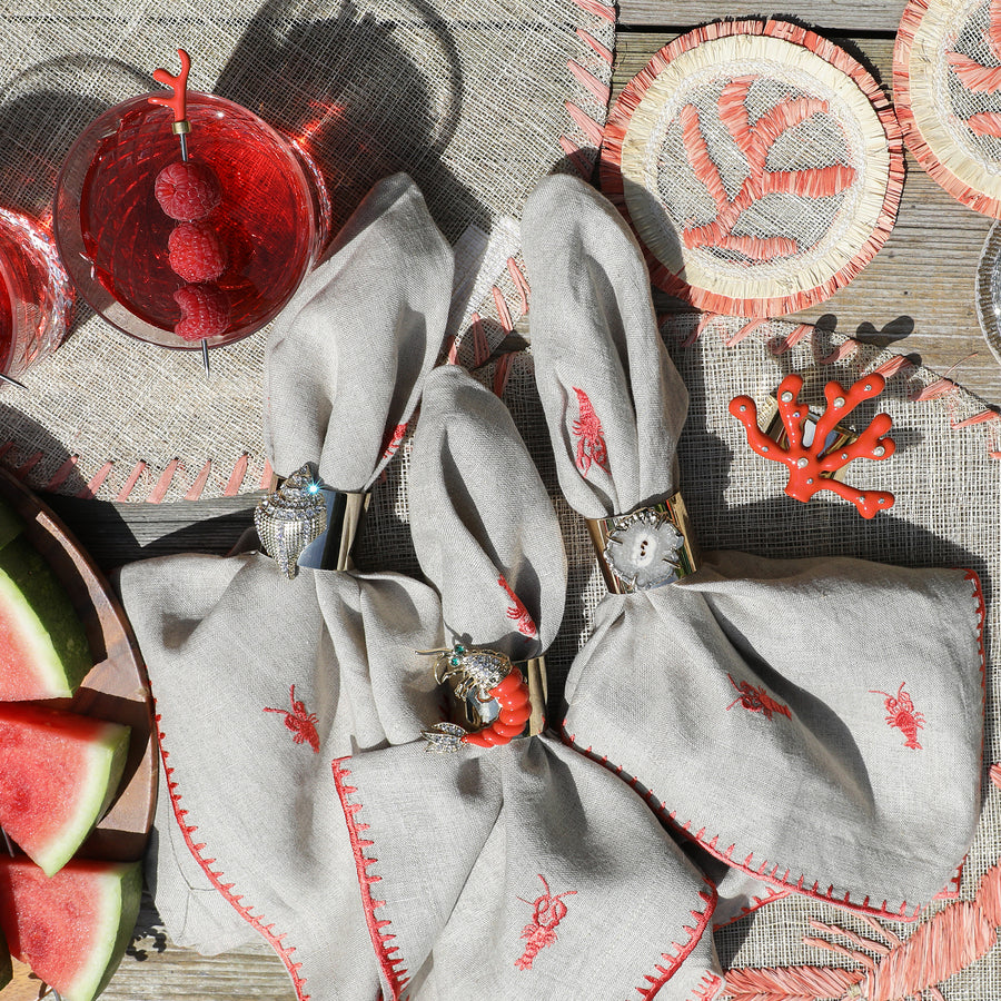 For me, summer really signals the beginning of the "free to eat as much lobster as I possibly can" way of living – so I just adore this table set with our lobster placemats and stunning, sparkling napkin rings. And we all know, lobster never goes out of style!! Thinking about how many ways you can play with these lobster placemats and napkins really gets me excited! I will be using them all Summer long... with an accent of blue for July 4th, and then with neutral accents as we have shown here for everyday beachside dining and garden brunches.