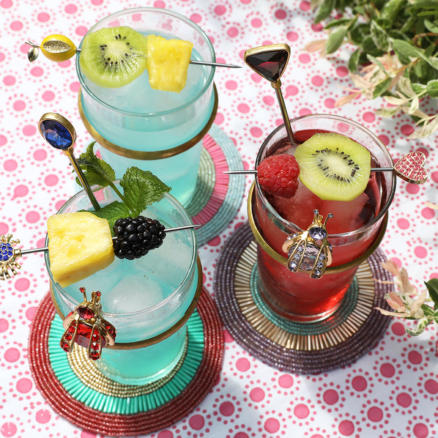 Crab wine charms $88.00 Gem bug clip set $78.00 Coral cocktail picks $88.00 Tassel cocktail napkins $88.00 Striped capiz tray, blue $288.00 Crab cocktail napkins $88.00