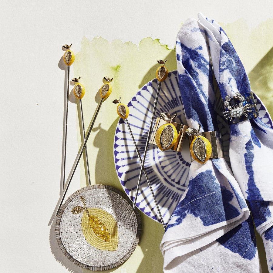 What a fresh and zesty table setting! Love the pop of yellow of this lemon napkin ring against a blue placemat. These lemons are hand enameled, full of crystal and so detailed....you will find endless reasons to use these napkin rings!