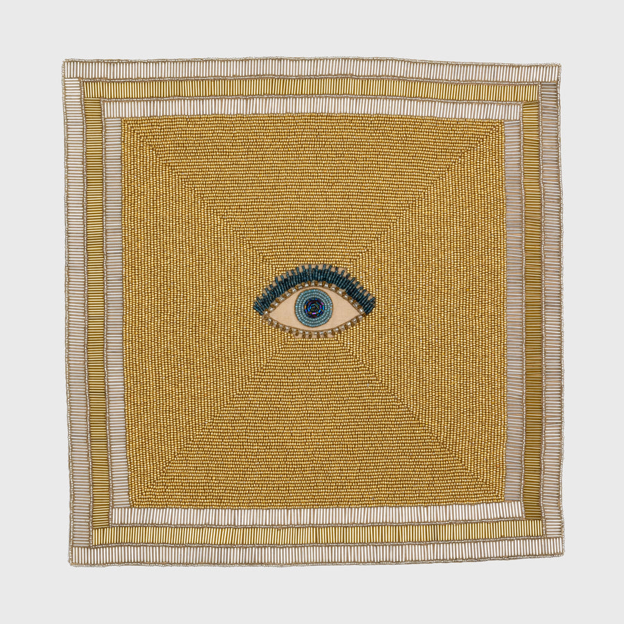 This beautiful evil eye placemat will be revealed when you lift your plate. The stunning border, created by hand with bugle beads, makes a striking statement and the eye is an all-seeing surprise.
