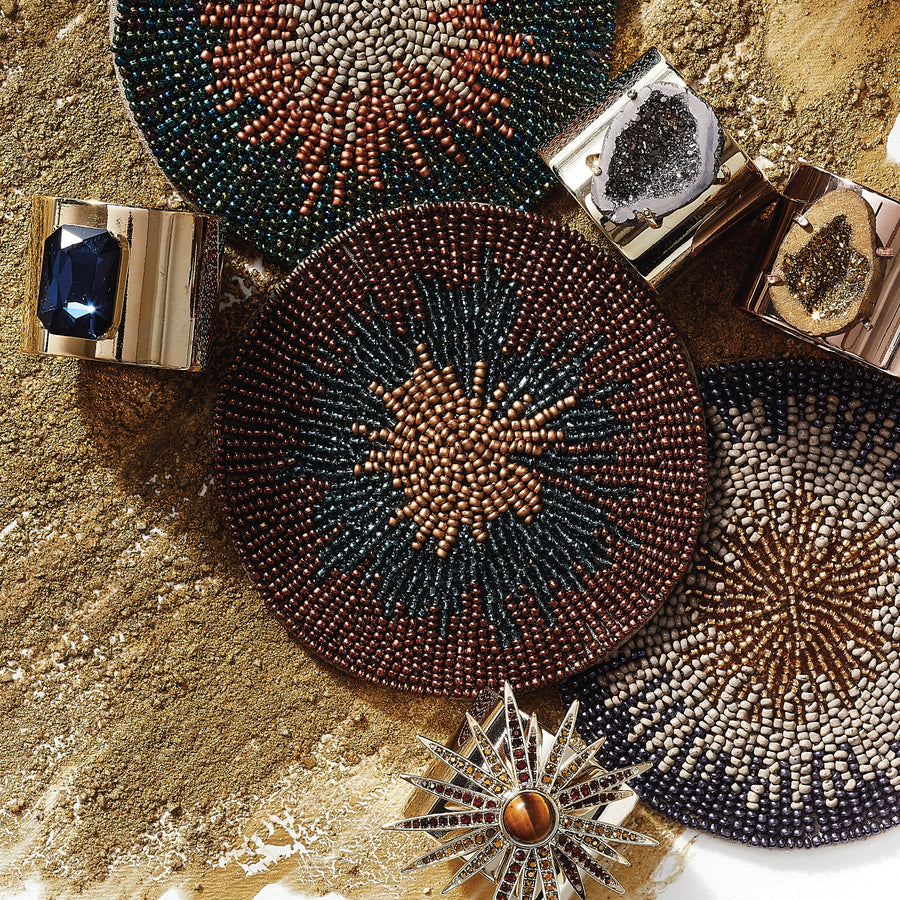 What a beautiful way to express the colours of the season, indigo and taupe and gold! Hand beaded with glass beads, these stunning coasters will be the talk of the cocktail party!