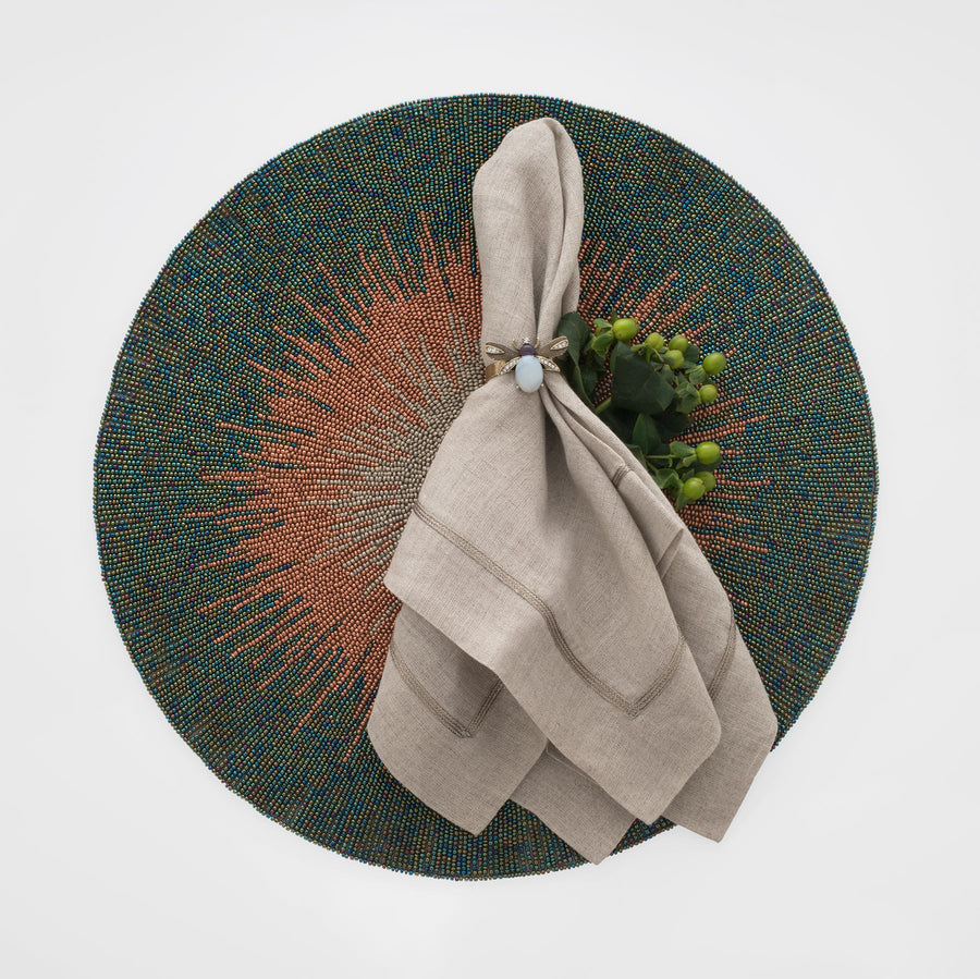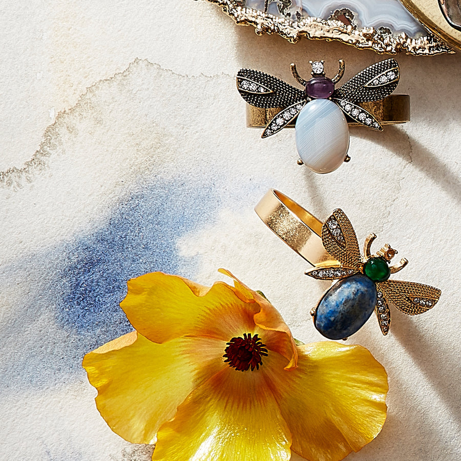 These antique gold finish napkin rings use semi-precious agate as the body stone and while they read neutral, the detail makes them full of interest and emotion.